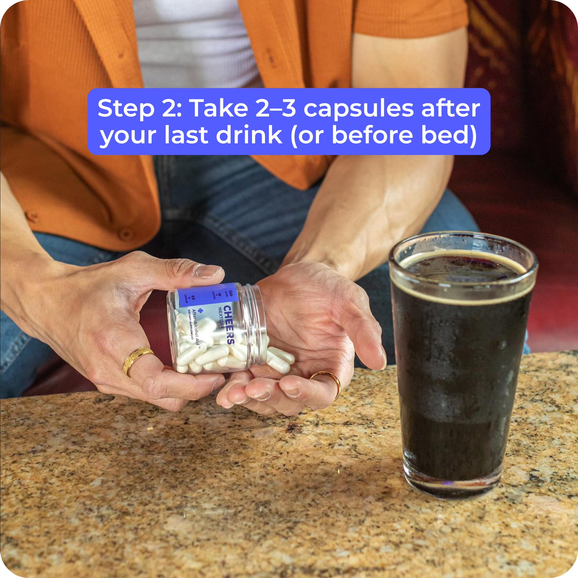 - Take 2–4 NextDay Cheers capsules right after your last drink or just before bed, with water.