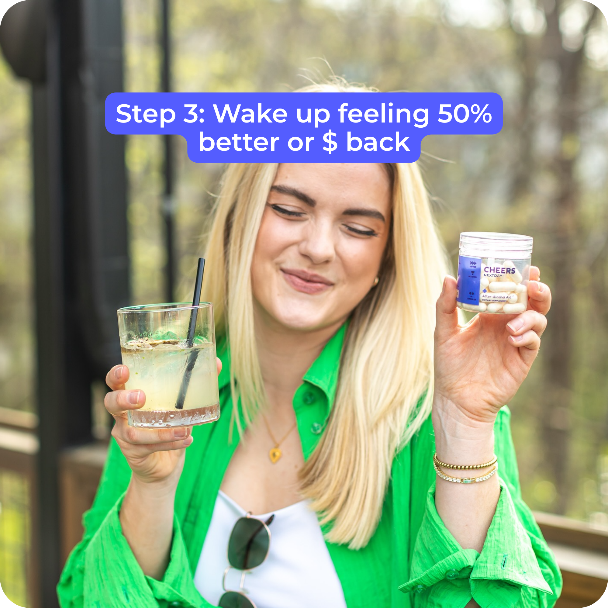 We’re so confident you’ll love Cheers, that we stand by our risk-free money-back guarantee. NextDay Cheers : If you try NextDay Cheers and don't feel at least 50% better the next day, and tell us about it within 60 days via email, we'll give you your money back.